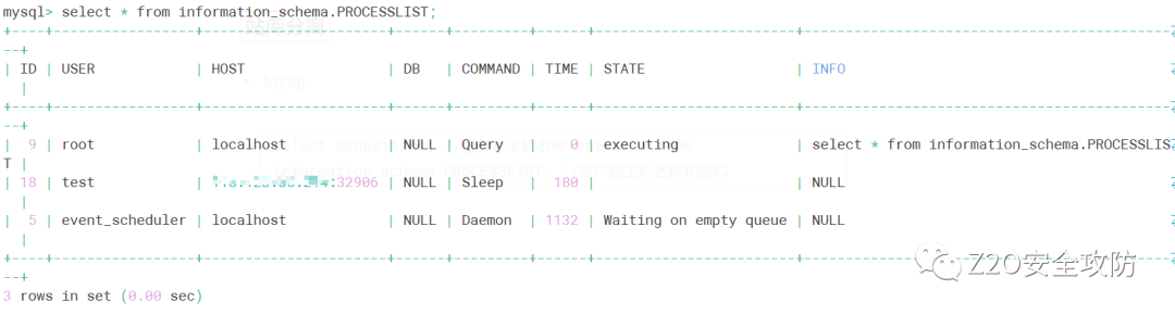select @@hostname; //服务端主机名称 select * from information_schema.PROCESSLIST; //客户端主机名称和端口Windows连接格式:主机名:PortLinux连接格式:IP:Port本地连接格式:localhost:Port
