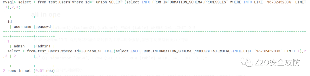 select * from test.users where id=1 union SELECT (select INFO FROM INFORMATION_SCHEMA.PROCESSLIST WHERE INFO LIKE '%673245283%' LIMIT