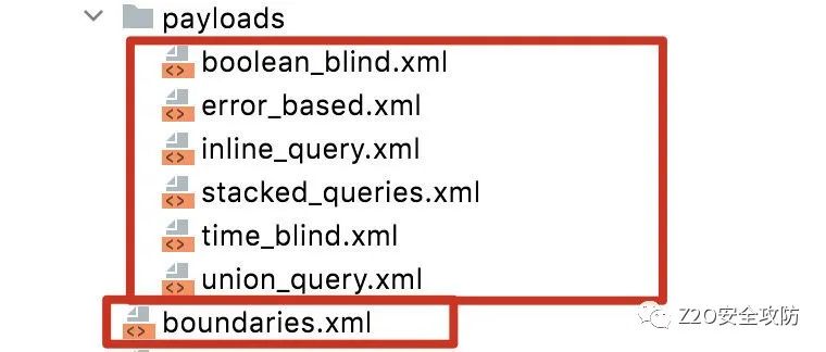 其中 prefix、comment、suffix 作为 boundary,boundary 用于闭合注入点的前后部分;test 则是最终如果闭合成功后必然执行的语句。因此 sqlmap 将 prefix 与 suffix 单独作为 boundaries 保存,而 test 和 comment 则根据注入方式和数据库的不同被划分为六个文件(路径:/data/xml/payloads