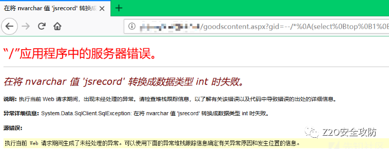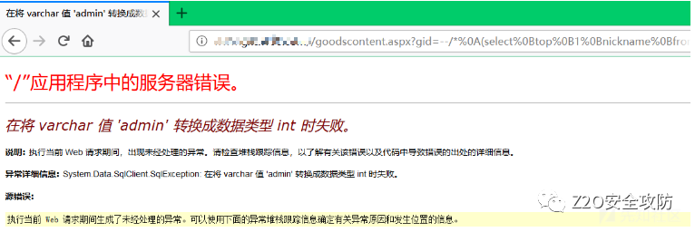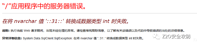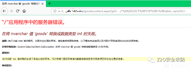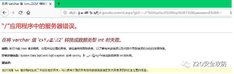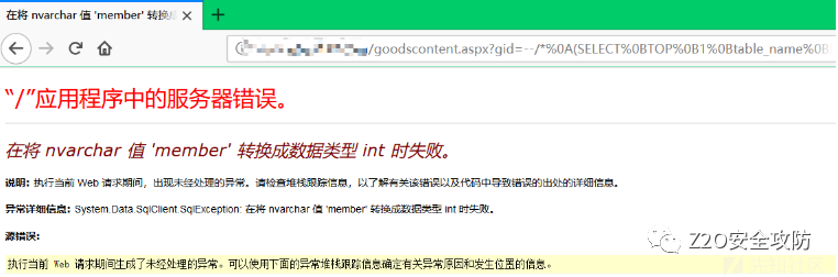 根据如上测试可以看出程序本身也有过滤,error为程序自身的过滤。可以利用IIS处理%符号的机制绕过部分符号,例如空格使用%0b 加号使用%2b等。再根据测试的结果,可以先利用convert转换报错获取一部分信息。