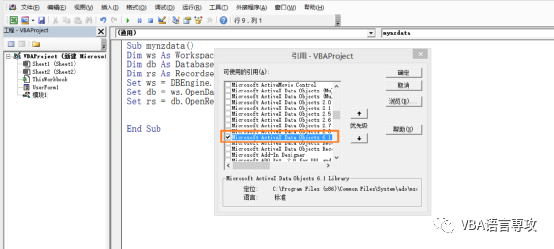 Microsoft ActiveX Data Object *.* Library,这里的*.*是指的时ADO的版本号,一般来说,应用程序或ActiveX控件都具有向下兼容性,所以我们尽可能选择比较新的版本.以确保程序在能识别旧版本Access的同时,也能识别较新版本的Access.