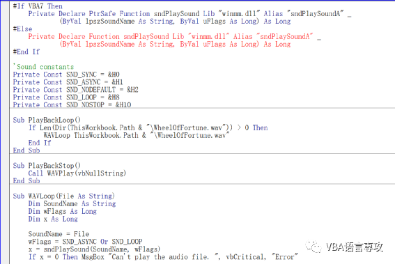 为了实现音效,我们看下面的代码:#If VBA7 Then Private Declare PtrSafe Function sndPlaySound Lib "winmm.dll" Alias "sndPlaySoundA" _ (ByVal lpszSoundName As String, ByVal uFlags As Long) As Long#Else Private Declare Function sndPlaySound Lib "winmm.dll" Alias "sndPlaySoundA" _ (ByVal lpszSoundName As String, ByVal uFlags As Long) As Long#End If 'Sound constantsPrivate Const SND_SYNC = &H0Private Const SND_ASYNC = &H1Private Const SND_NODEFAULT = &H2Private Const SND_LOOP = &H8Private Const SND_NOSTOP = &H10 Sub PlayBackLoop() If Len(Dir(ThisWorkbook.Path & "\WheelOfFortune.wav")) > 0 Then WAVLoop ThisWorkbook.Path & "\WheelOfFortune.wav" End IfEnd Sub Sub PlayBackStop() Call WAVPlay(vbNullString)End Sub Sub WAVLoop(File As String) Dim SoundName As String Dim wFlags As Long Dim x As Long SoundName = File wFlags = SND_ASYNC Or SND_LOOP x = sndPlaySound(SoundName, wFlags) If x = 0 Then MsgBox "Can't play the audio file. ", vbCritical, "Error" End Sub Sub WAVPlay(File As String) Dim SoundName As String Dim wFlags As Long Dim x As Long SoundName = File wFlags = SND_ASYNC Or SND_NODEFAULT x = sndPlaySound(SoundName, wFlags) If x = 0 Then MsgBox "Can't play the audio file. ", vbCritical, "Error" End Sub 代码截图:代码的讲解:以上代码实现的是音效的播放和停止,利用的是一个API函数。由于API函数功能强大,但不是VBA范畴,我只是调用,不再过多讲解,如果大家有兴趣,我会送给大家一份相当全的API函数资料。 【分享成果,随喜正能量】 真诚是很珍贵的东西。即使不善言辞,偶尔有些笨,有些迟钝,也没关系。日久见人心,真诚会在时间中闪闪发光。希望你努力做一个真实的人,而不是别人眼中正确的人。时光端午 ,祝福夏安。。 我20多年的VBA实践经验,全部浓缩在下面的各个教程中: