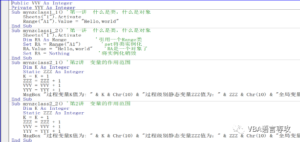 代码截图:在两个模块中我分别加入了过程Sub mynzclass2_1() Sub mynzclass2_2() Sub mynzclass2_3();同时在模块1的开始定义了全局变量VVV和模块变量YYY