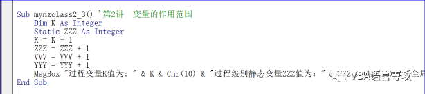 MsgBox "过程变量K值为: " & K & Chr(10) & "过程级别静态变量ZZZ值为:" & ZZZ & Chr(10) & "全局变量VVV值为:" & VVV & Chr(10) & "模块变量YYY值为:" & YYY
