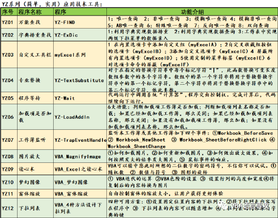 对于初级及中级的学员,很想看到VBA的利用价值。也是对自己知识点的整合。我推出的YZ系列工具,可以让这个阶段的学员感受到VBA之强大。坚定自己学习VBA的决心。VBA工具共两个系列,一个是YZ系列,一个是NZ系列。YZ系列比较简单些,实用性强,可以在自己的工作中方方面面都可以利用到,今日给大家介绍的是YZ系列工具: