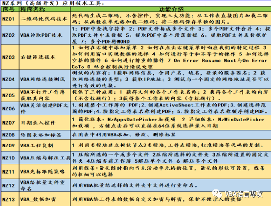 我的教程一共九套及VBA汉英手册一部,分为初级、中级、高级三大部分。是对VBA的系统讲解,从简单的入门,到数据库,到字典,到高级的网抓及类的应用。大家在学习的过程中可能会存在困惑,这么多知识点该如何组织成自己的程序呢?VBA可否能组织一个大型的程序呢?如何让VBA形成一个工具,拿来就用呢?在我的教程完结后,我陆续推出这类技术工具资料,这类工具整合了若干多的VBA知识点,让大家感受到VBA之强大。工具资料共两个系列,一个是YZ系列,一个是NZ系列。今日给大家介绍的是NZ系列工具: