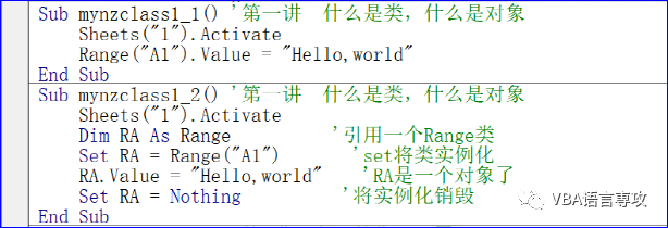让我们先来看一条非常简单的程序,亲身体会一下类的庐山真面目: Sub mynzclass1_1() '第一讲 什么是类,什么是对象 Sheets("1").Activate Range("A1").Value = "Hello,world"End Sub 上面代码的第二句:Range("A1").Value = "Hello,VBA world",我们把这这句代码全部放开,把隐藏的补充完整,看看是什么样子:Application.ActiveWorkbook.ActiveSheet.Range("A1").Value="Hello,VBA world" 我们解释一下:1) Range("A1")为对象,指定单元格.2) Range("A1")前面,ActiveSheet也是对象,指定了哪个工作表。3) ActiveSheet前面又有一个对象ActiveWorkbook,指定了是哪个工作薄,4) ActiveWorkbook前面还有一个Application,指定的是哪个应用。 那么其中的Value是什么?Value是一个Range("A1")这个对象的一个属性。那它是从哪来的呢?它是由Range类定义的。那么range是类还是对象呢?别急,我慢慢讲解,希望大家通过我的讲解能理解类和对象的关系。在上面的讲解中,我们提到实例化类为具体对象的过程,其实在mynzclass_1引用了一个Range类,并将之实例化后修改了它的属性。而在例子中,我们只不过是将这一切都隐藏起来,直接对一个对象Range("A1")修改它的属性,但Range("A1")这个对象正是引用了Ragne这个类,才具有了Range类的属性"Value"。 我们把上面的代码转换一下:Sub mynzclass1_2() '第一讲 什么是类,什么是对象 Sheets("1").Activate Dim RA As Range '引用一个Range类 Set RA = Range("A1") 'set将类实例化 RA.Value = "Hello,world" 'RA是一个对象了 Set RA = Nothing '将实例化销毁End Sub 代码截图: 代码的运行: 上述第二段代码是上面mynzclass1_1的原始代码,从中我们看出类本身并不直接为我们做什么,但是,它却又一直默默地隐藏在幕后规化着我们的动作。是的,这就是类。它是通过对象的方式展现在我们的面前,让我们无时无刻不与之交流,却又常常在不经意间忽视了它的存在。现在,再回到mynzclass1_1去看,就会很容易的发现,ActiveSheet实际引用了Worksheet类、ActiveWorkbook引用了Workbook类,而Application则引用了和它同名的Application类(这也正是我们会经常被混淆的一个概念,一个对象可以和被它所引用的类同名),原来我们在短短一个赋值的语句中,已经在与这么多的类打交道。那我们又要怎样来区分类和对象呢?其实它们经常成对地出现在我们面前,只是一个是看得见摸得着的,一个却深藏不露。我们可以这样去理解类与对象:类是一个概念或是一种定义,每个类拥有其自己的特征和行为方式,而对象就是某个类的实例。所以类是对象的“灵魂”,它无处不在,而你却看不到它。比如:汽车。如果作为类:汽车的定义为有四个或者四个以上轮子,人能够坐在上面,操作它行走的工具(好难的定义)。这个时候“汽车类”是有自己的属性,如:汽车的前轮(是负责转向的)。汽车的前玻璃(是负责挡风的)等等。这里的“汽车”是一个概念抽象的概念。而我们通常指的汽车是作为对象:如丰田汽车,就是汽车类中的一个大对象,这个大对象中还有小的对象,如“威驰FS”对象,属性:轮子是某某牌子的,前挡风玻璃是某某牌子的。这些就是很具体的属性值了。今日内容回向:1 什么是类?2 类和对象的联系是什么? 本讲内容参考程序文件:VBA-CLASS(1-28).xlsm 我20多年的VBA实践经验,全部浓缩在下面的各个教程中: 【分享成果,随喜正能量】人生的路上离不开朋友,有一个值去珍惜和记挂的朋友,便是人生的福气。。