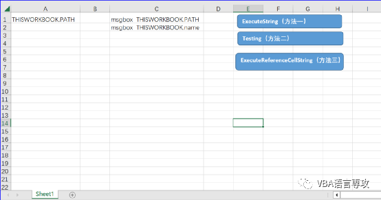 在上述1,2中我们给出的“THISWORKBOOK.PATH”和“msgbox THISWORKBOOK.PATH”“msgbox THISWORKBOOK.name”均是字符串,并在工作表中给出。我们要解决的是把这些字符串从工作表中提取出来,转义成代码的语句,并执行,反馈结果。