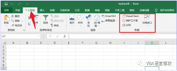 实现这个功能的是我提供的myExcelB.xlsm文件,如果加载正确,会在主页选项卡旁边看到一个新选项卡“个人收藏”。如下截图: