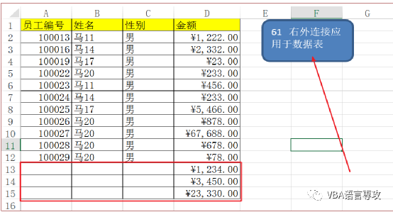 我们要在两个工作表间建立一个右连接,连接的条件是员工编号相同,提取字段为:a.员工编号,a.姓名,a.性别,b.金额 ,大家可以想象一下将会返回什么样的一个结果呢?