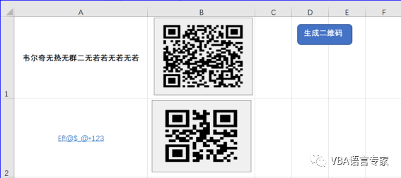 在上面的工作表中,A1单元格我展示的是汉字形成二维码;A2单元格我展示的是英文、特殊符号、数字形成二维码。您只要在两个单元格中录入要生成二维码的内容,然后点击“生成二维码按钮”即可以在B1和B2单元格中的图片画布中形成二维码了。