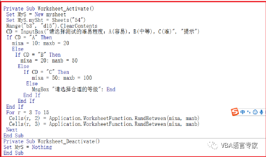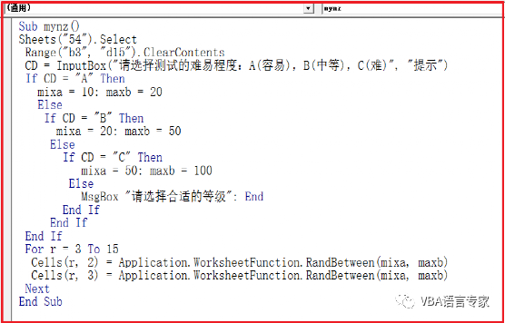 当用户选择的是容易的级别,那么数值1和数值2的数据取值是10和20 之间;当用户选择的“中等”级别,那么数值1和数值2的数据取值是20和50 之间;当用户选择的是难的级别,那么数值1和数值2的数据取值是50和100之间。大家在看代码的时候要注意,这里利用了一个工作表函数RandBetween。