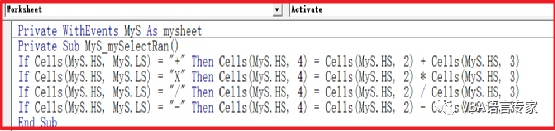 上述代码是mySelectRan事件实现触发后的过程,当我们单击工作表的A列时,当满足一定条件后会触发mySelectRan事件,在这个事件过程中,会根据A列单元格的运算符号实现数值1和数值2的运算。