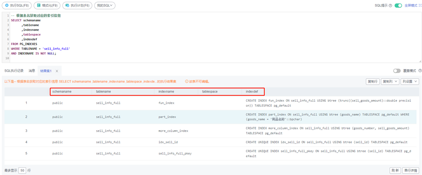 indexdef | text | - | 索引定义(一个重建的CREATE INDEX命令)。 |