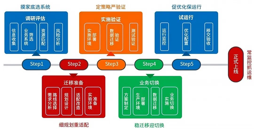 该阶段主要工作目标:根据实验验证确定迁移方案,稳步实施迁移,迎接切换里程碑。业务切换建议以新旧系统双轨模式开展工作,即以旧系统为主,新系统为辅,通过业务分流策略,对新业务系统进行上线使用,待经过充分试运行后,逐步进行旧系统下线,在此过程中要保持新旧系统协同联动,制定完善的切换应急方案。
