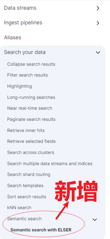 在 Elasticsearch 8.9 版本上新了:Semantic search 语义检索功能,对官方文档熟悉的同学,你会发现如下截图内容,早期版本是没有的。