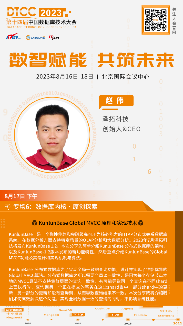 本次大会主题:“数智赋能,共筑未来”。在这场中国数据库技术大会上,泽拓科技创始人&CEO 赵伟将会分享《KunlunBase Global MVCC原理和实现技术》。