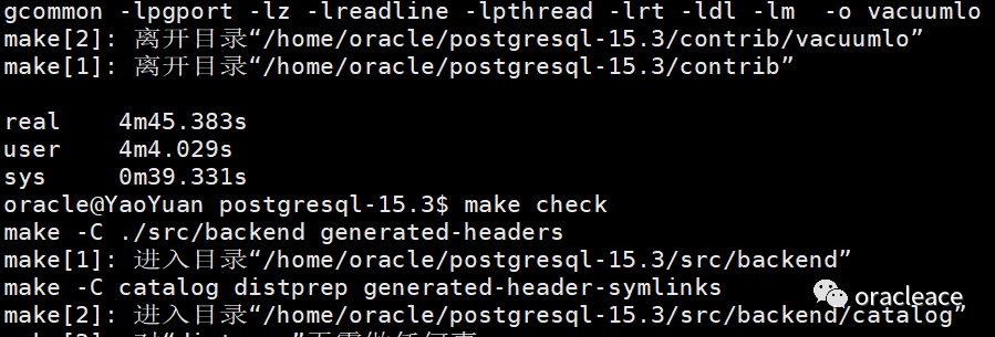 ./configuremake worldsudo make install-world...parallel group (2 tests): event_trigger oidjoinsevent_trigger ... ok 111 msoidjoins ... ok 200 mstest fast_default ... ok 130 ms============== shutting down postmaster ============================ removing temporary instance =====================================All 212 tests passed.=======================make[1]: 离开目录“/home/oracle/postgresql-15.3/src/test/regress”oracle@YaoYuan postgresql-15.3$ sudo make install-world