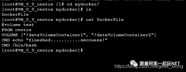 #volume testFROM centosVOLUME ["/dataVolumeContainer1", “/dataVolumeContainer2”]CMD echo “fineshed…seccuess!”CMD bin/bash
