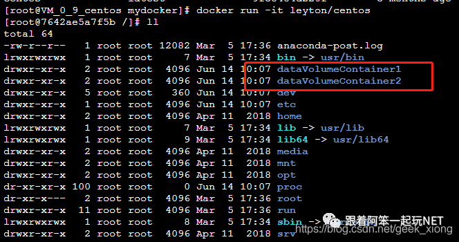 由上图可知创建了一个新的镜像名叫leyton/centos,当我们运行这个镜像时,就会调用两个数据卷
