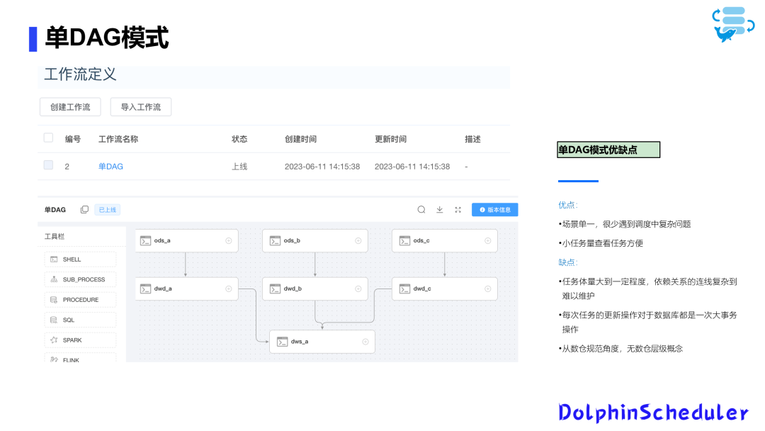 尽管此模式较为简单并易于理解,但当任务数量庞大时,维护的困难性就会显现出来。在DS的2.0版本及之后,DAG的更新变成了一个大型事务操作,这对数据库压力较大。