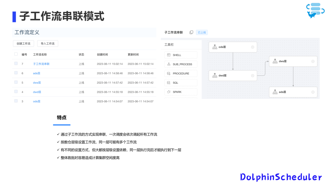 它与数据仓库规范相对应,例如按照常见的数据仓库分层如ODS层、DW层、DWS层和ADS层,通过串联这些层级的子工作流来进行调度。