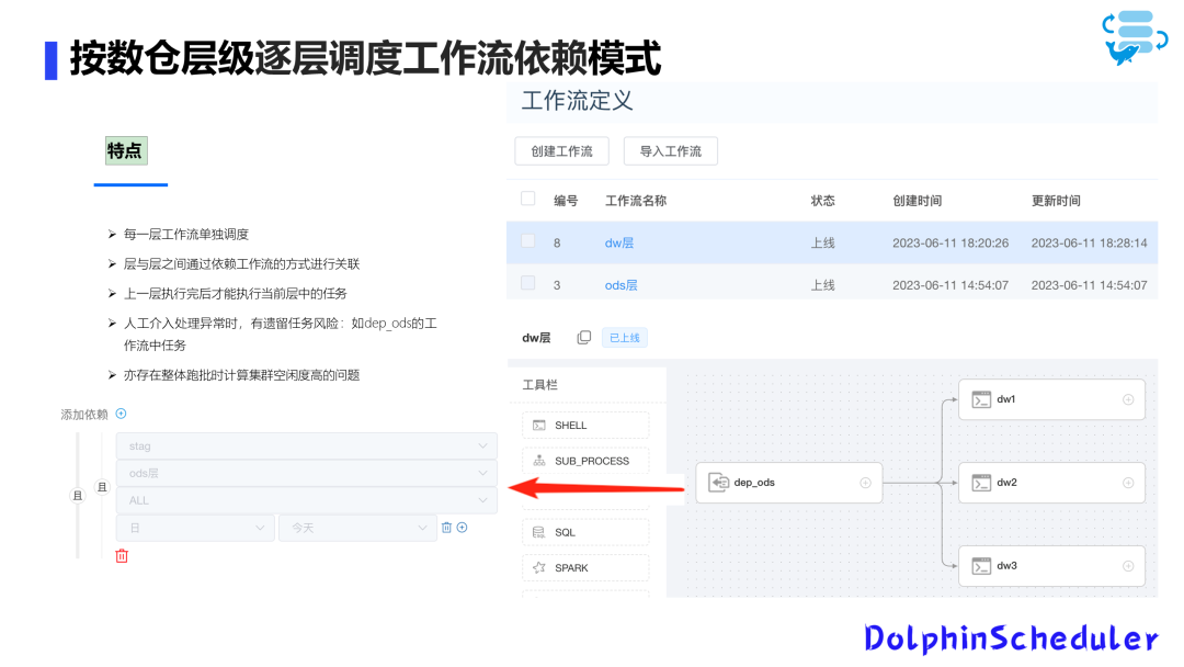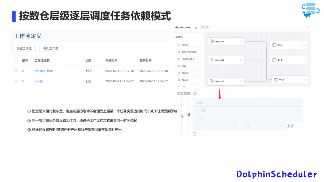 按数据仓库层级调度任务跑批模式则更具灵活性,它按照依赖节点进行任务调度,而非按子工作流配置。