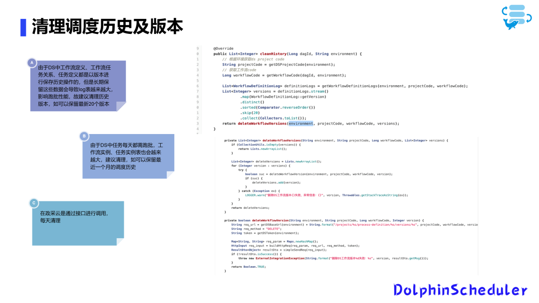 具体的清理方法包括删除过时的工作流定义版本,可以使用"DELETE"接口删除无用版本。另外,可以调用"DELETE"接口删除过时的工作流实例,从而清理调度历史。