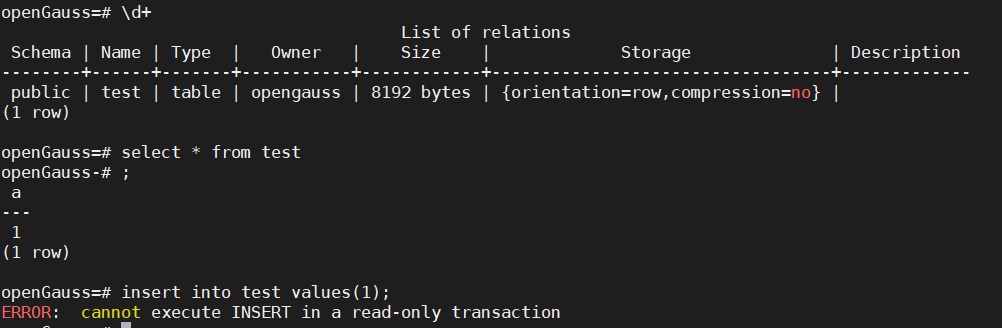 public | test | table | opengauss | 8192 bytes | {orientation=row,compression=no} |