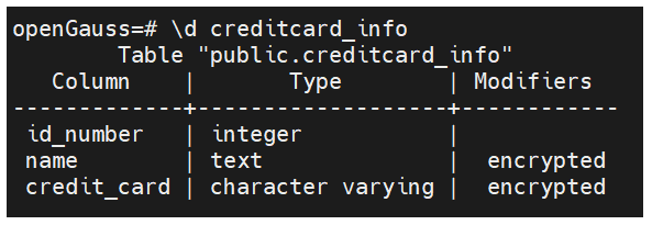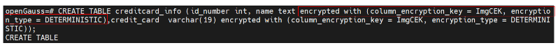 CREATE TABLE creditcard_info (id_number int, name text encrypted with (column_encryption_key = ImgCEK, encryption_type = DETERMINISTIC),credit_card varchar(19) encrypted with (column_encryption_key = ImgCEK, encryption_type = DETERMINISTIC));
