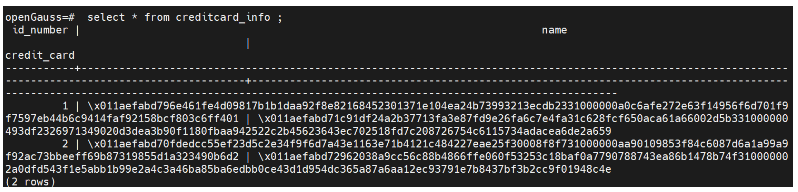 查看上面创建的密态表,可以看到后面两列是加密的: