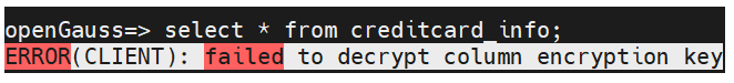 被赋予了查询权限的用户(本例为fishinwater),即使打开密态开关,也无法查询加密数据,报错如下:ERROR(CLIENT): failed to decrypt column encryption key
