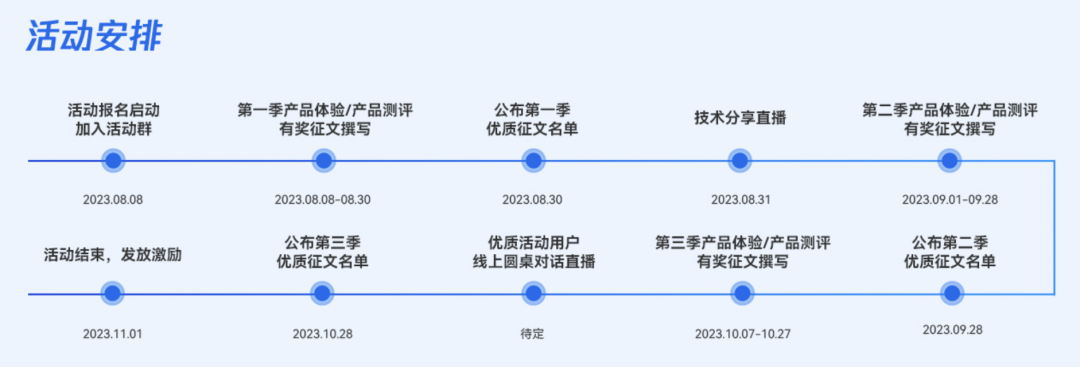 本次活动设置 技术分享直播、三期有奖征文、获奖用户线上圆桌对话 等环节,每期征文选出10位获奖用户,共设置2.4万元奖池。整体活动节奏和奖品安排如下: