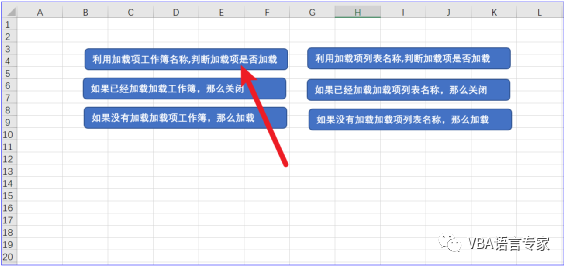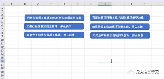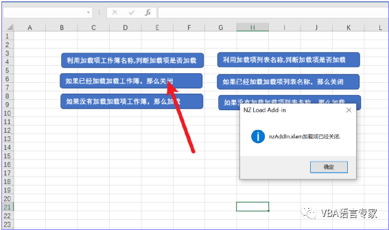 非常简单明了,整个程序可以实现6大功能:利用加载项工作簿名称,判断加载项是否加载;利用加载项列表名称,判断加载项是否加载;如果已经加载加载工作簿,那么关闭;如果已经加载加载项列表名称,那么关闭;如果没有加载加载项工作簿,那么加载;如果没有加载加载项列表名称,那么加载。