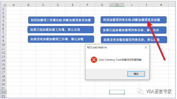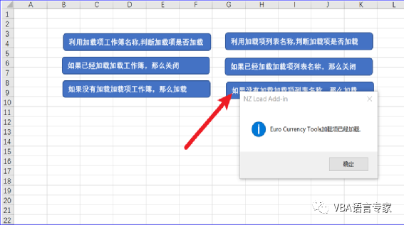在程序中我们检测的是"nzAddIn.xlam"加载项工作簿,以及加载项列表名称为"nzAddIn"和"Euro Currency Tools"的项目,"Euro Currency Tools"是EXCEL自带的。"nzAddIn.xlam"和"nzAddIn"是我在程序中给出的测试文件,读者可以自己添加到加载项列表中。