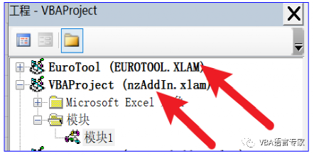 这个时候,由于程序已经加载了两个加载项,我们看一下VBA窗口: