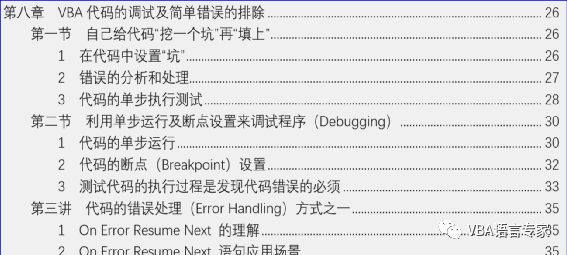 错误处理,是我们在调试程序时经常用到的。正如上面的题目中提到的:“自己给代码“挖一个坑”再“填上””,是不是无用功呢?不是。这是我们为了让程序交到用户手中时少一些抱怨。在调试过程中设置的一些错误,也是为了调试数据的必须。在这套教程中,我给大家讲解了如何让代码单步运行以期达到调试错误的目的,还介绍了断点的设置,这个时候是可以自动提示各个变量的值,从而让我们了解代码的运行程度。教程中还介绍了错误的常用错误处理语句:On Error Resume Next On Error GoTo line On Error GoTo 0 。对于错误的处理语句,我一向的观念是尽可能不要用,或者说能不用就不用。如果说我们在对代码的分析后,可以得出那处会产生错误,那么我们可以用一些代码去解决,消灭掉这萌芽的错误,比如说有一个可能会出现除数为零的错误,那么我们就可用一个判断语句,当除数不为零时再做这个除法。 (待续) 【分享成果,随喜正能量】 我20多年的VBA实践经验,全部浓缩在下面的各个教程中: 【分享成果,随喜正能量】尊圣敬善,仁慈博爱。以一颗仁爱之心善待万物、敬畏外物、悲悯万物,我们拥有怎样的未来,取决于当下的行动。。