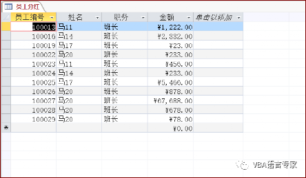 1 strSQL = "SELECT a.员工编号,a.姓名,a.性别,b.金额 FROM "