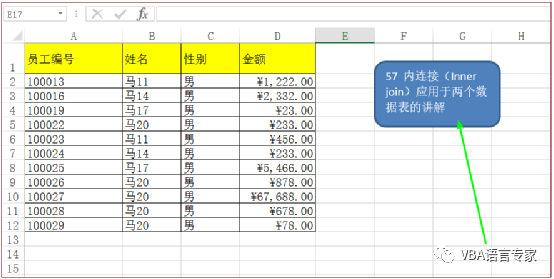 大家好,我们继续讲解VBA数据库解决方案,今日讲解第57讲内容: 内连接(Inner join)应用于两个数据表的讲解。这讲的内容还是讲内连接的应用,我们在上一讲中讲了内连接在工作表中的应用,今天的内容是内连接在数据表中的应用。大家要清楚我本书中常用的一些概念,工作表指的是EXCEL文件中的工作表,数据表是指我们数据库中的数据表,是两个不同的概念。对于数据表而言,我此书中讲解的主要利用的是accdb 数据库。