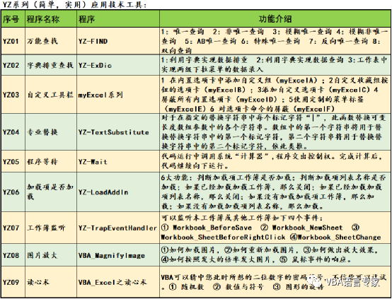 对于初级及中级的学员,很想看到VBA的利用价值。也是对自己知识点的整合。我推出的YZ系列工具,可以让这个阶段的学员感受到VBA之强大。坚定自己学习VBA的决心。VBA工具共两个系列,一个是YZ系列,一个是NZ系列。YZ系列比较简单些,但实用性更强,可以在自己的工作中方方面面都可以利用到,今日给大家介绍的是YZ系列工具: