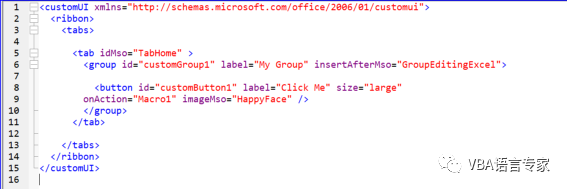 如果在 CustomUI 编辑器中打开文件,会看到 Excel 2007 的 customUI.xml 文件中的 RibbonX及 Excel 2010-2016 中 customUI14.xml的 RibbonX。