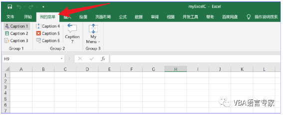 实现这个功能的是我提供的myExcelC.xlsm文件,如果加载正确,会在主页选项卡旁边看到一个新选项卡“我的菜单”。如下截图: