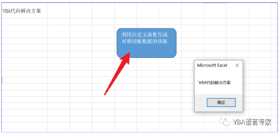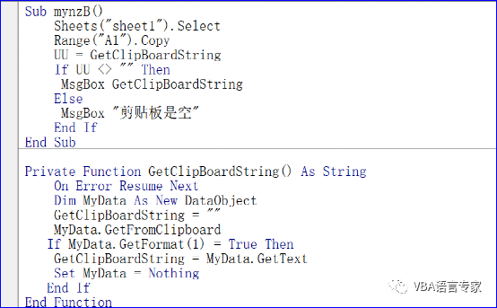 有了上面的基本知识点,我们来看如何利用自定义函数实现提供给用户剪贴板的文本内容,我先给出我的代码:Sub mynzB() Sheets("sheet1").Select Range("A1").Copy UU = GetClipBoardString If UU <> "" Then MsgBox GetClipBoardString Else MsgBox "剪贴板是空" End IfEnd SubPrivate Function GetClipBoardString() As String On Error Resume Next Dim MyData As New DataObject GetClipBoardString = "" MyData.GetFromClipboard If MyData.GetFormat(1) = True Then GetClipBoardString = MyData.GetText Set MyData = Nothing End IfEnd Function 代码截图:代码讲解: 1)GetClipBoardString 是我们自定义的一个提取剪切板文本内容的过程。 2)MyData.GetFromClipboard 将剪贴板中的数据复制到MyData对象中 3)If MyData.GetFormat(1) = True 是判断数据格式是否为文本。4)GetClipBoardString = MyData.GetText 提取文本数据作为函数的返回值