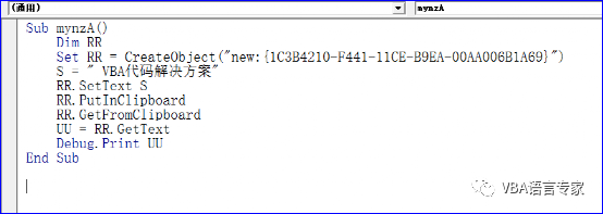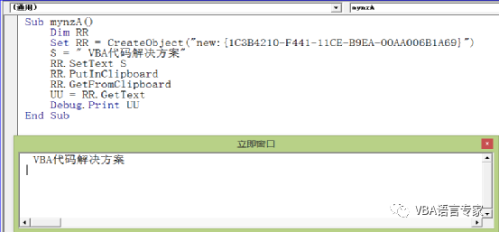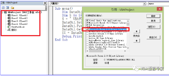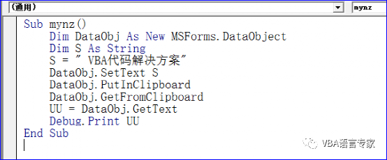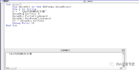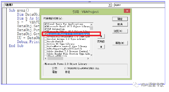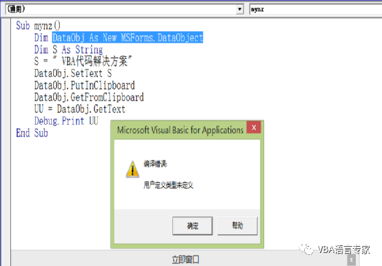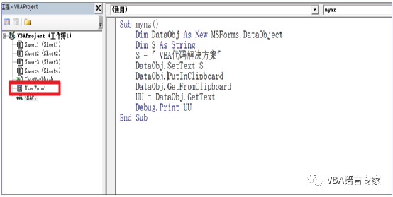 为了实现上述第一和第二部分的代码,我们给出最初的代码: Sub mynz() Dim DataObj As New MSForms.DataObject Dim S As String S = " VBA代码解决方案"DataObj.SetText SDataObj.PutInClipboardDataObj.GetFromClipboard UU = DataObj.GetTextDebug.Print UUEnd Sub 代码截图: 代码的讲解:1)Dim DataObj As New MSForms.DataObject建立一个DataObject的对象2)S = " VBA代码解决方案"给出要操作的字符串3) DataObj.SetText SDataObj.PutInClipboard将S的内容写入剪贴板。4)DataObj.GetFromClipboard读取剪贴板内容5)UU = DataObj.GetTextDebug.Print UU取得文本内容并在即时窗口打印上述过程从理论上讲没有任何问题,好了我们运行一下看看结果: 如下图,这是为什么呢?就是因为我们没有建立前期的引用。在上一讲中我们讲过要建立Forms 2.0 Object Library的引用,那么如何建立这个应用呢?很简单,我们只需插入一个窗体然后删除即可。如下: 这个时候我们打开引用的库:即使删除了窗体后这个引用也是存在的: 我们再次运行程序:这时程序正常运行。