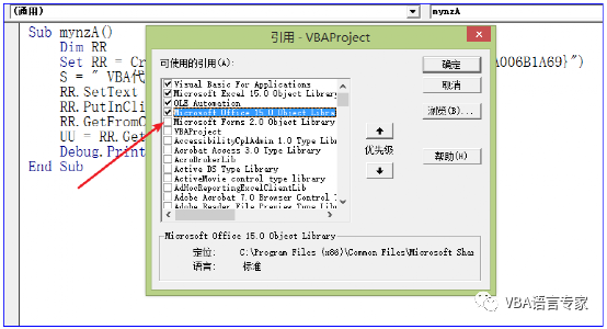 在上部分的讲解中,我们实现了前期绑定的代码,如果我们不想费事不想做前期的绑定,该如何写代码呢?我先给出下面的代码:Sub mynzA() Dim RR Set RR = CreateObject("new:{1C3B4210-F441-11CE-B9EA-00AA006B1A69}") S = " VBA代码解决方案"RR.SetText SRR.PutInClipboardRR.GetFromClipboard UU = RR.GetTextDebug.Print UUEnd Sub 代码截图:代码讲解:这种实现是一种后期绑定的方案,这种方案的讲解我在这套教程的上册中有讲解,这里不再多讲。我们先看一下运行的结果: 在后期绑定中,是没有上述form2库引用的,我们看看后期绑定的引用库:好了,这讲就讲到这里,我们实现了利用剪贴板的前期和后期绑定的两种方案。 本节知识点回向:①实现剪贴板操作的前期绑定如何实现?② 实现剪贴板操作的前期绑定引用的是什么库?③ 实现剪贴板操作的后期绑定如何实现? 本讲代码参考文件:012工作表.xlsm 我20多年的VBA实践经验,全部浓缩在下面的各个教程中,教程学习顺序: 【分享成果,随喜正能量】生活就是用一两分钟的甜,冲淡那七八分钟的苦。