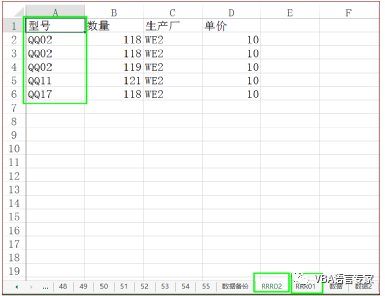 [A1:D1] = Array("型号", "数量", "生产厂", "单价")