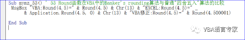 代码解析:Mynz过程分别调用VBA内置的Round函数和工作表Round函数在消息框中显示两者运算结果