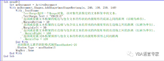 ),是我推出第八套教程,教程是专门讲解VBA在Word中的应用,围绕“面向对象编程”讲解,首先让大家认识Word中VBA的对象,以及对象的属性、方法,然后通过实例让大家感受到Word VBA 的妙处。本套教程共三册十六章,今日内容为第九章:Shapes对象和Shape对象的第4节:VBA添加图形和文字及阴影