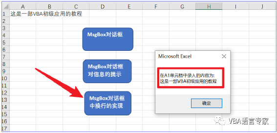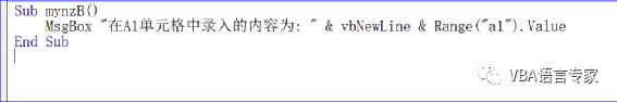 MsgBox "在A1单元格中录入的内容为: " & vbNewLine & Range("a1").Value