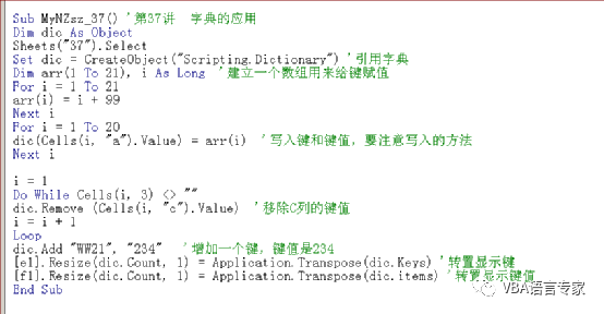 1)上述代码首先创建一个字典对象,然后,把工作表A列的值放到数组,作为键;第三步是给字典的键赋值,第四步移除C列的键对,第五步,增加一个键,第六步显示